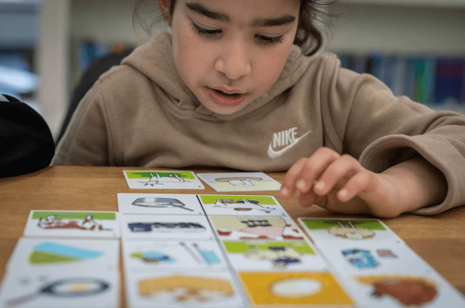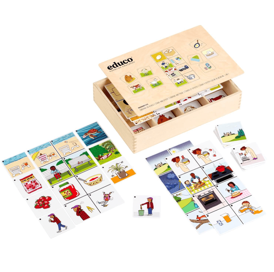 Oorzaak-gevolg bestaat uit themaborden met elk 8 bijpassende beeldkaartjes. Bij 2 naast elkaar liggende afbeeldingen op het themabord wordt telkens vooraan en achteraan een beeldkaartje toegevoegd, zodat er een duidelijke, logische en chronologische volgorde ontstaat van de 4 afbeeldingen. Met zelfcontrole.