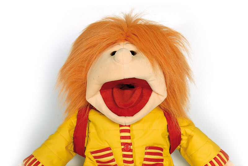 De handen van de poppenspeler zijn ook de handen van Bas. De mond en de tong kun je van binnen uit bewegen. In de grote mond kun je veel dingen laten opeten. In de jas en de broek zitten zakken. Op zijn rug heeft Bas een grote rode rugzak.