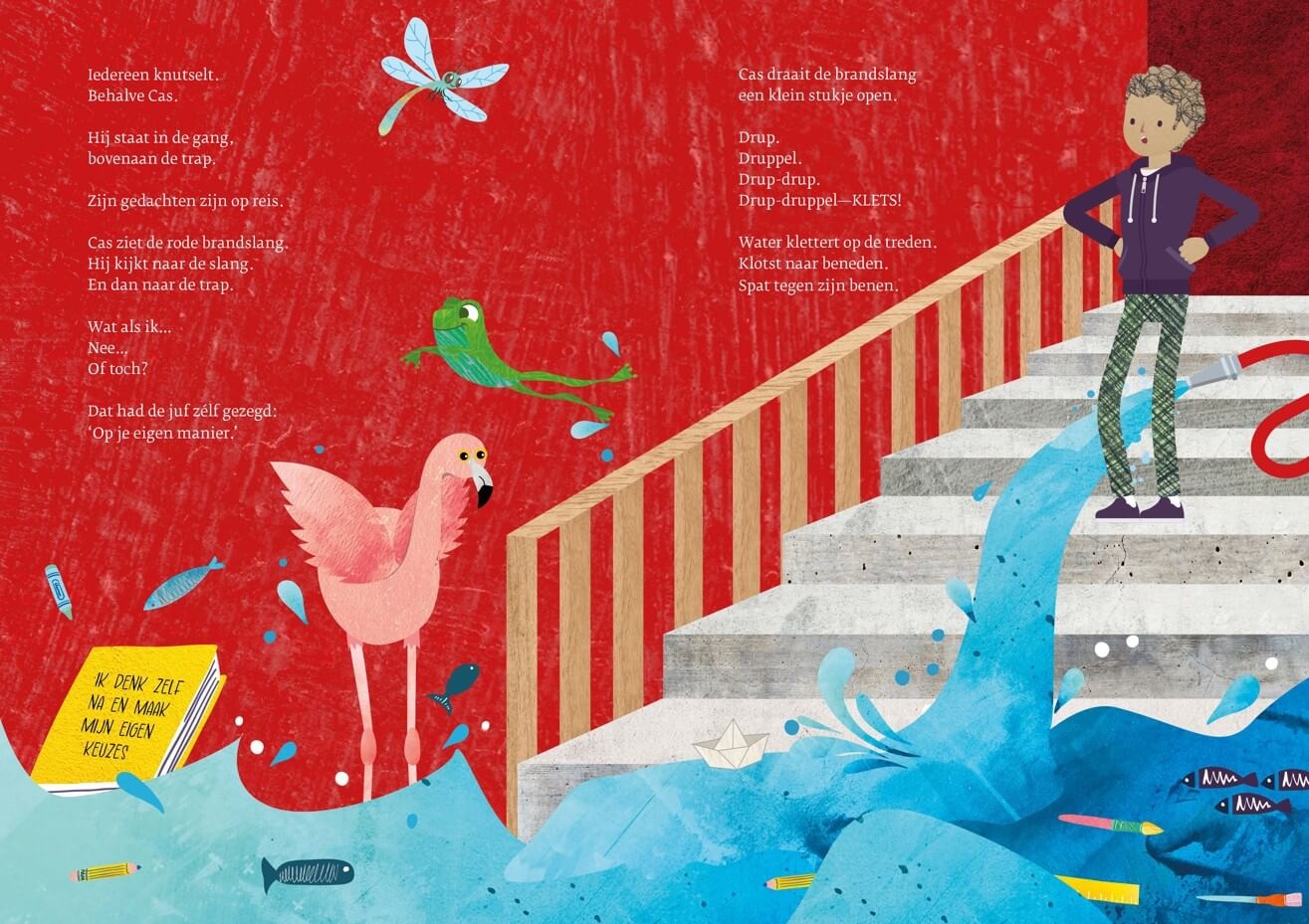 … Cas en de wonderlijke waterval is een speels en fantasierijk prentenboek over lef, verbeelding en jezelf durven zijn, bedacht en geschreven door Michel Linthorst, geïnspireerd door verhalen en tekeningen van de leerlingen van KC de Cascade.