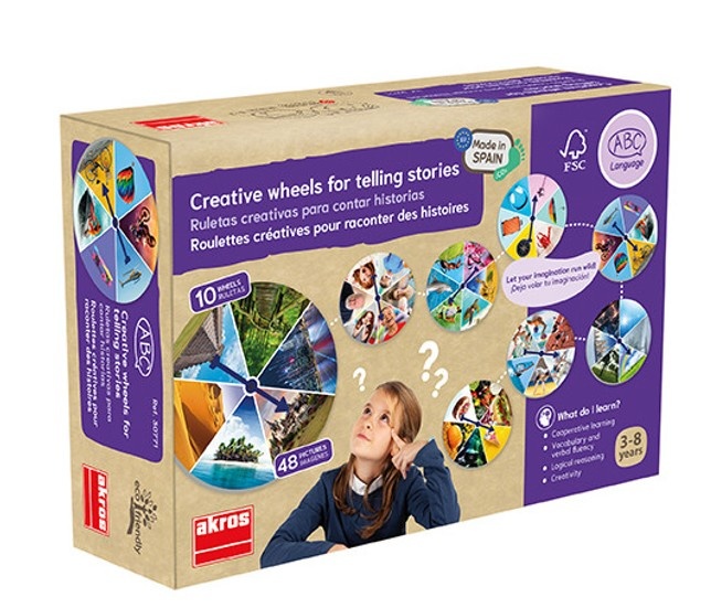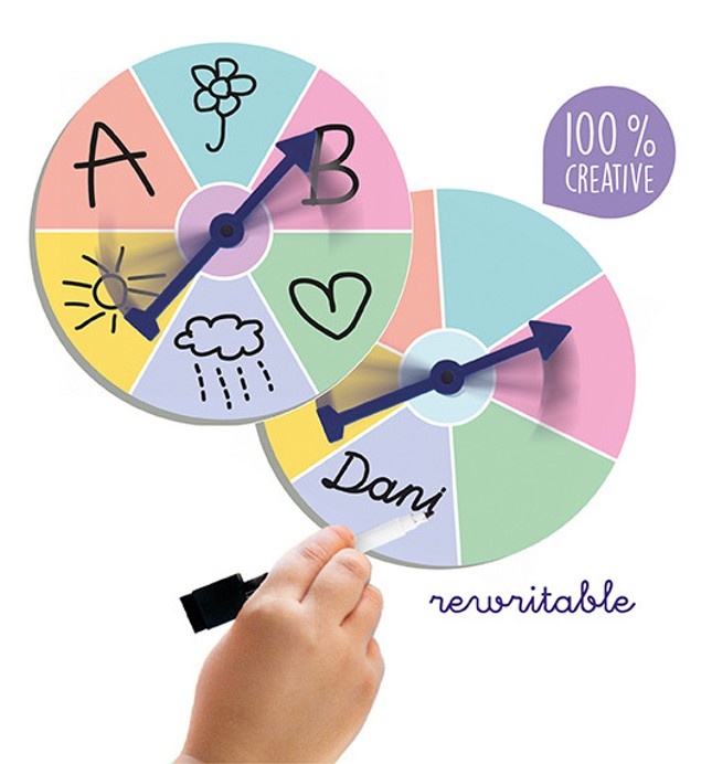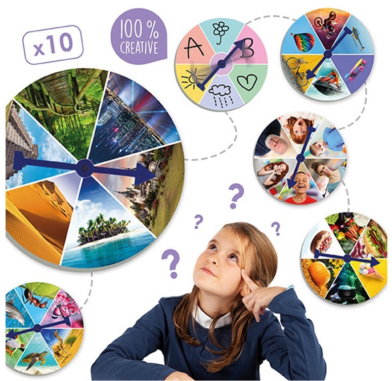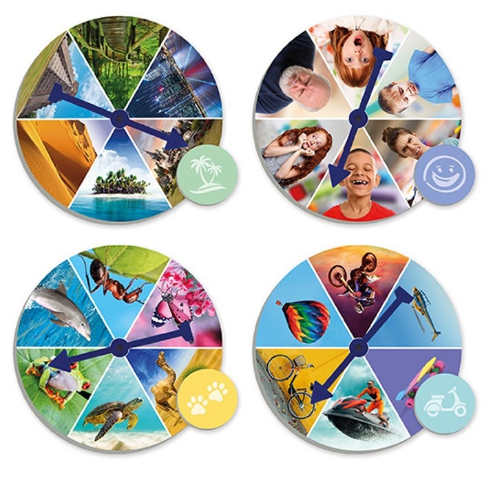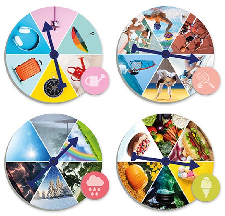Draai aan de schijven, bekijk de afbeeldingen en laat je fantasie de vrije loop! Inclusief 8 thematische draaischijven met afbeeldingen uit het dagelijkse leven, 2 herschrijfbare draaischijven, een uitwisbare stift en kaarten met pictogrammen om de draaischijven toe te wijzen en aan te geven wie er aan de beurt is.