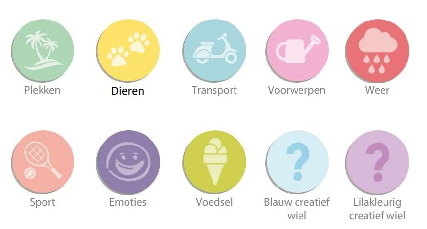 Inhoud: 8 stevige kartonnen draaischijven (115 mm), 2 beschrijfbare draaischijven van stevig karton (115 mm), 10 stevige ronde kartonnen kaarten (42 mm), 1 kartonnen spreekkaart (70 mm) en 1 whiteboard marker. Verpakt in een stevige kartonnen koffer.