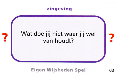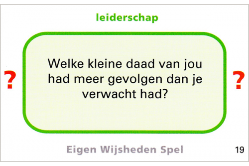 Het Eigen Wijsheden Spel brengt u op een speelse wijze met anderen in gesprek over de manier waarop u tegen onderwerpen als communicatie, verandering of leiderschap aankijkt. Daarnaast nodigen de prikkelende vragen in dit spel je uit om deze onderwerpen te koppelen aan je persoonlijke ervaringen.