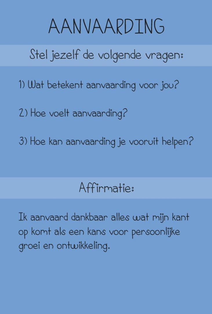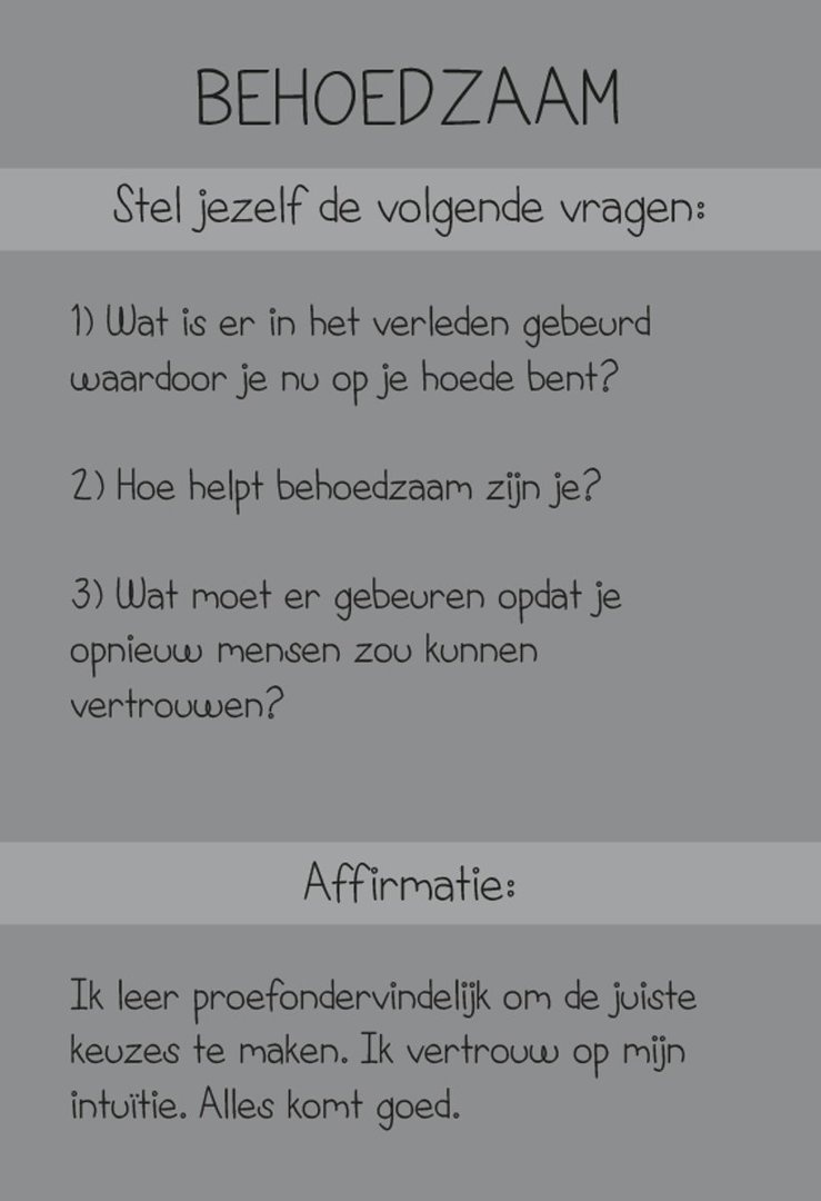 Kies de kaart die het beste aansluit bij hoe je je voelt of neem een willekeurige kaart uit de stapel en ga ermee aan de slag. Probeer de vragen op de achterkant zo eerlijk mogelijk te beantwoorden en gebruik de affirmaties om één te worden met je eigen gevoelswereld.