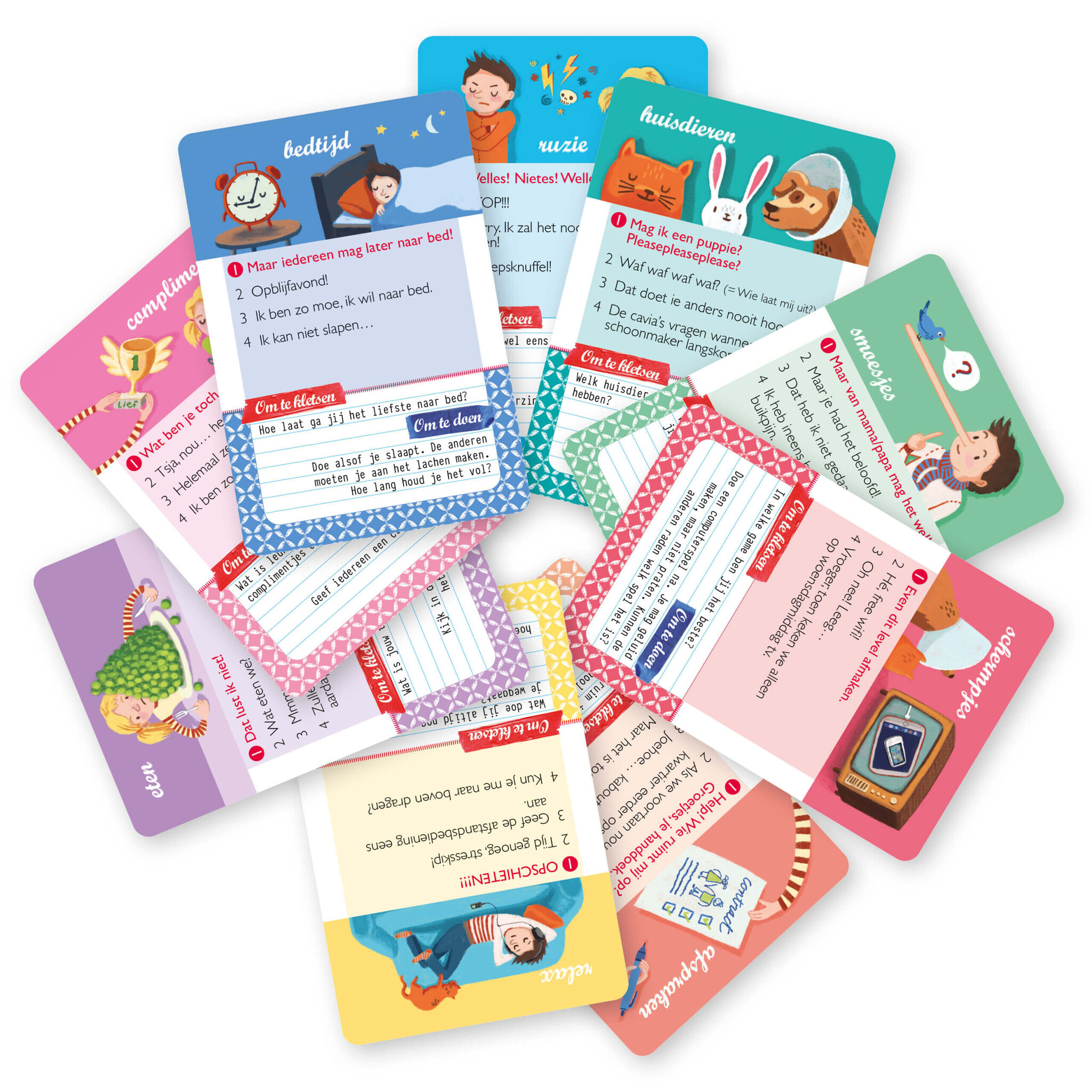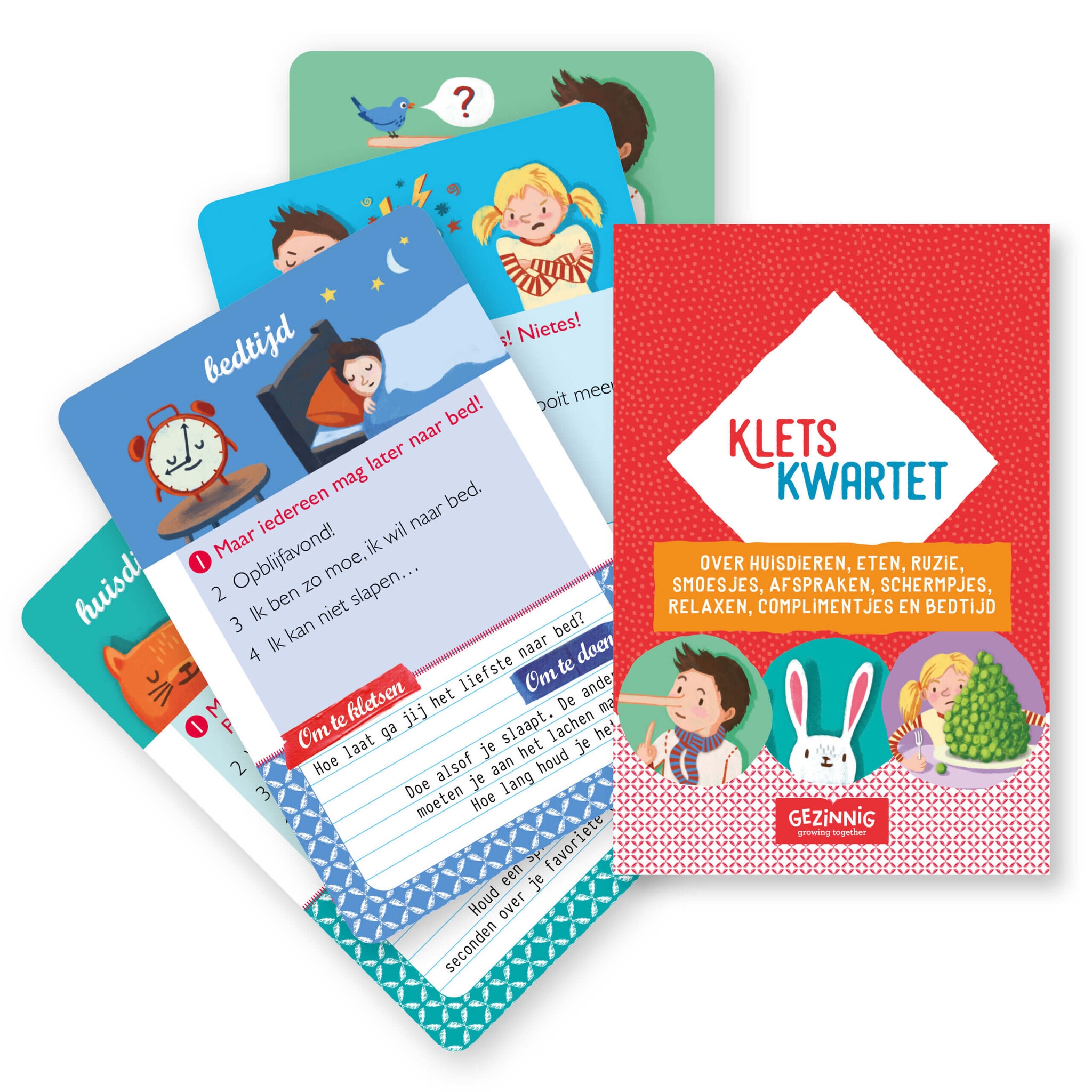 Familieklets! is een vrolijk spel over huisdieren, eten, ruzie, smoesjes, afspraken, schermpjes, relaxen, complimentjes, bedtijd en ander gezinsgedoe. Familieklets! is leuk en waardevol voor kinderen (6+) en ouders, het is ook geschikt voor eenoudergezinnen of samengestelde gezinnen. Een spel, vier varianten. Je kunt Familieklets! op vier manieren spelen. Om te kletsen, om te doen, verzin een verhaal of speel een potje kletskwartet!