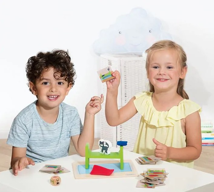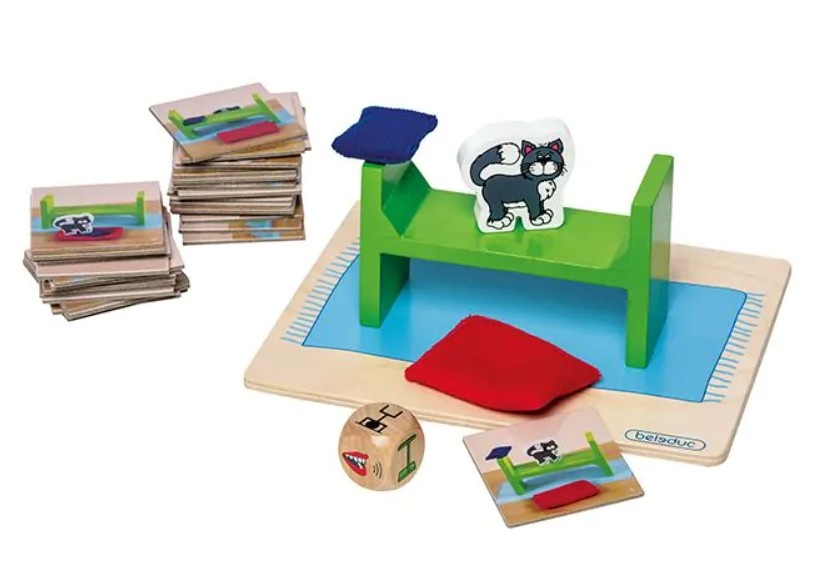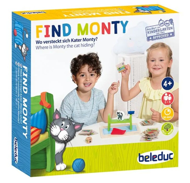 Ruimtelijk geheugenspel. De kat Monty heeft zich verstopt. Maar waar? Ligt Monty onder het bed of op het kussen. De kinderen krijgen een afbeelding van de verstopplaats te zien en moeten deze (uit het hoofd) nabouwen. Al spelenderwijs wordt de spraak-, taal- en ruimtelijke ontwikkeling getraind. De kinderen leren begrippen als boven, onder, naast, tussen, voor, achter enzovoort. Voor 2-5 spelers.