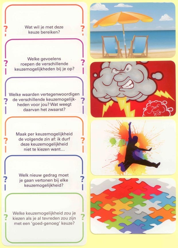 Naast de vragen bevat het spel ook een set van 29 kaarten met afbeeldingen. Daarmee kun je op een associatieve manier kijken naar de keuze waar je voor staat.