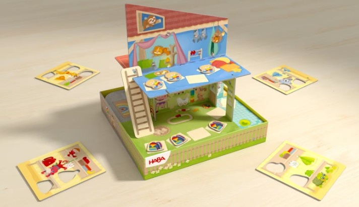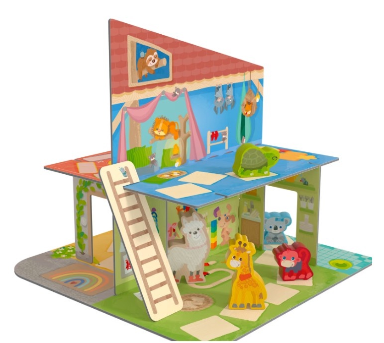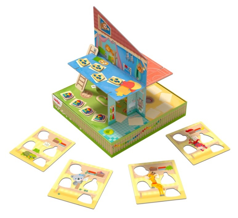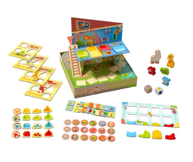 Inhoud: Mijn eerste spellen. Een kartonnen speelhuis in 3D met 10 verschillende spelideeën en 5 grote houten dierenfiguren. Verpakt in een stevige kartonnen opbergdoos (formaat 330 x 330 x 60 mm), inclusief instructieboekje met 10 spelvormen.