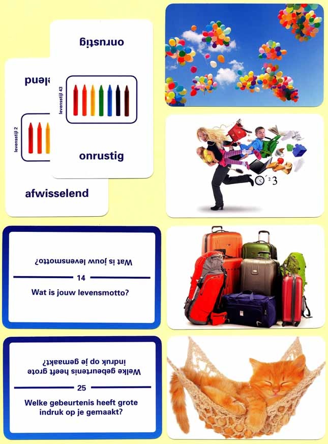- Levensstijlen. Op deze set kaarten vind je omschrijvingen die van toepassing kunnen zijn op het leven dat je nu leidt of zou willen leiden. Voorbeelden daarvan zijn: chaotisch, gezond, gestresst of zorgeloos.