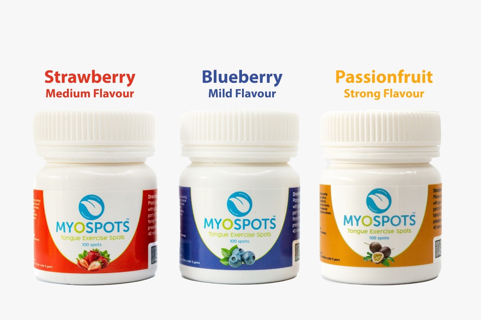 Myospots zijn een effectief hulpmiddel om de juiste tongpositie aan te leren, verkrijgbaar in 3 smaken en verpakt per 100 stuks