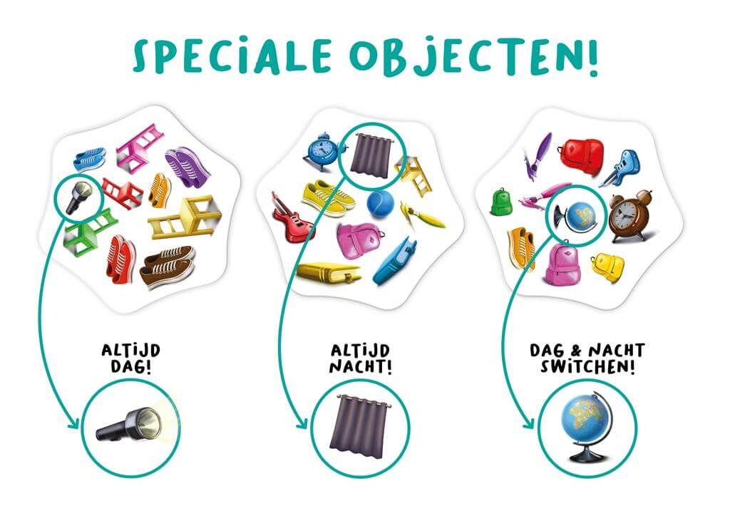 Draai een kaart om, doorzoek de rommelige kamer en probeer als eerste de kleur of het figuur te vinden die het meest voorkomt. Tijdens de dag kun je dankzij het zonlicht de juiste kleur zien. Tijdens de nacht, kun je zonder licht enkel vormen zien en moet je het juiste voorwerp zoeken. Hoe snel kan jij je focus 'switchen'?