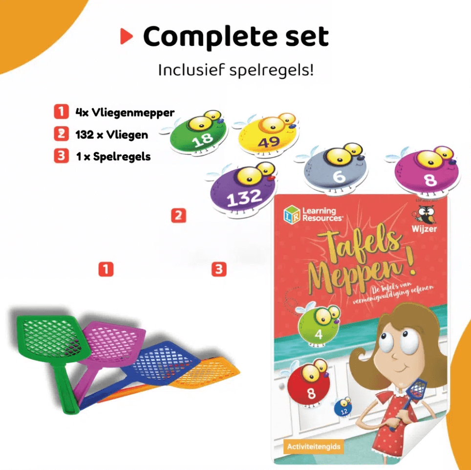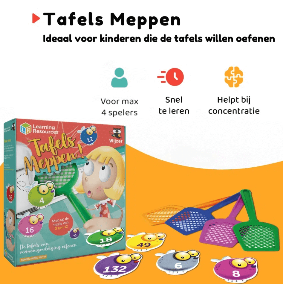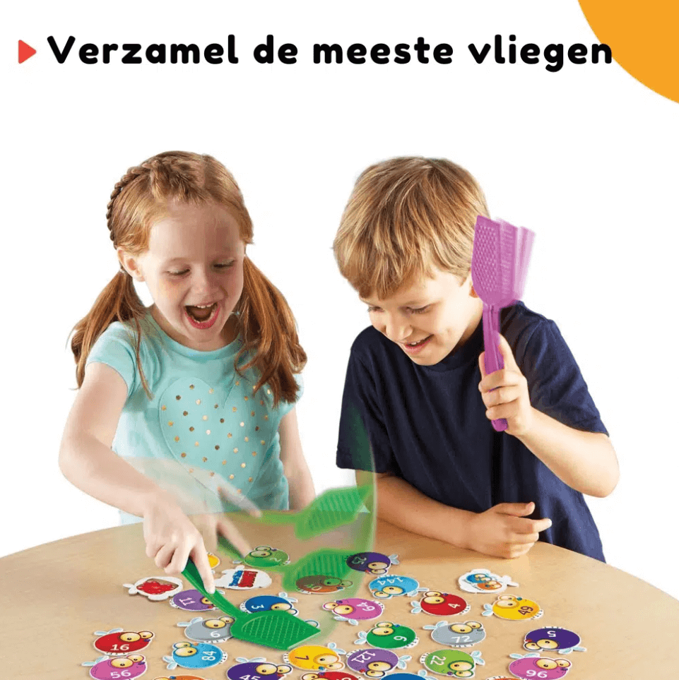 Verzamel de meeste vliegen om te winnen en leer zo spelenderwijs de tafels van vermenigvuldiging. Oefen meerdere tafels tijdens 1 spel of concentreer je juist op de moeilijke sommen waarvoor je kind wat extra oefening kan gebruiken. Het spel is moeilijker te maken voor extra uitdaging. Bijvoorbeeld door je kind een kaart te laten meppen en de bijbehorende deling te roepen (‘12 gedeeld door 4 is 3’).
