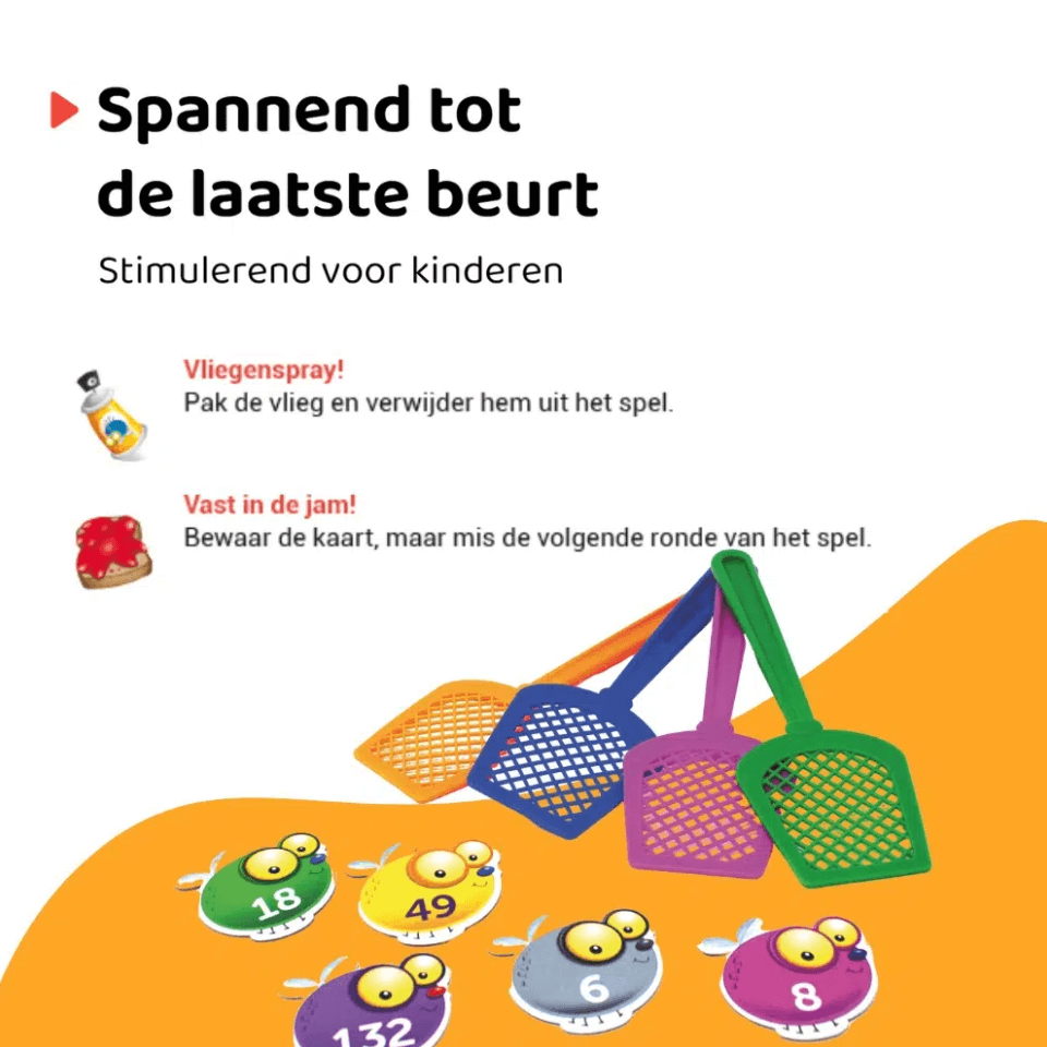 Spannend en leuk! Speel samen met je kind of in een groepje (tot 4 spelers). Je kunt als ouder een tafelsom roepen of spelers roepen om de beurt een tafelsom. De ‘vliegenspray’, ‘jam’ en ‘vriendelijke vlieg’ zorgen voor extra leuke spelelementen.