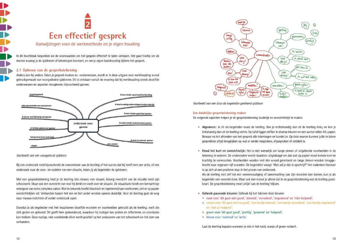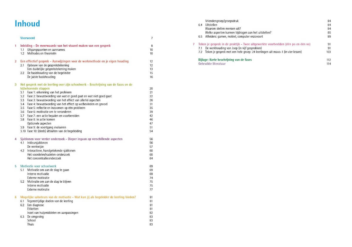 Alle sjablonen zijn echter ook in een groep te gebruiken. Zo staat in deze uitgave beschreven hoe je een groep leerlingen kunt stimuleren en begeleiden om ieder zijn eigen werkhouding te onderzoeken en tot acties te komen. Net als de vorige uitgaven van Teken je gesprek is ook dit boek weer een handige tool, waarmee je de leerling – op maat – kunt helpen, motiveren en stimuleren.