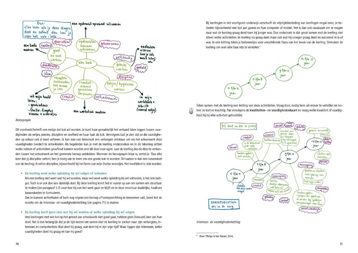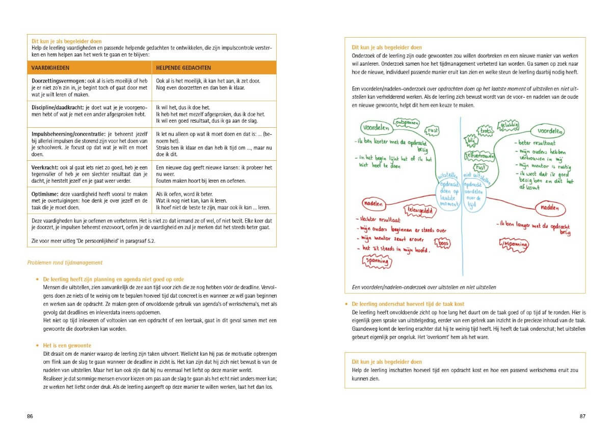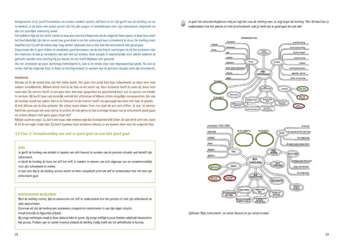 In Teken je gesprek over werkhouding komt uitgebreid aan bod hoe je een leerling in dit proces precies kunt helpen om eerst tot inzicht en vervolgens tot een succesvolle uitvoering van zijn zelfbedachte acties en plannen te komen. De begeleiding komt het best tot zijn recht in een een-op-eensituatie; je kunt dan goed aansluiten bij de behoefte van de leerling.