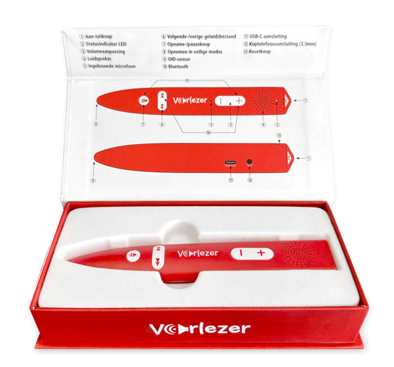 Inhoud: De Voorlezer (smart reading pen) nieuwe versie, 8Gb, incl. 800 productiestickers. Verpakt in een kartonnen opbergdoos.