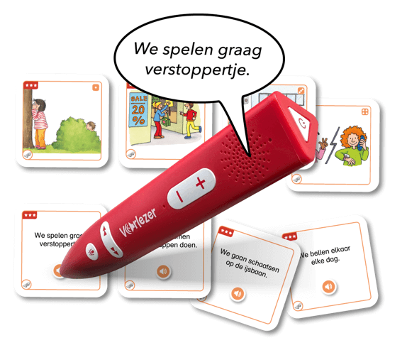 Met de Voorlezer kunnen leerlingen zich vanaf het eerste moment al luisterend een basiswoordenschat eigen maken. De Voorlezer is een ‘sprekende’ pen, die elk aangestipt woord (en/of het bijbehorende plaatje) van de gekoppelde en voorleesbare boeken hardop voorleest. Producten die werken met de Voorlezer, zijn o.a. de leer-luisterboeken van NT2, praat mee! De leerlingen kunnen op een aantal posters en grote plaatjes met de pen op ontdekkingsreis gaan en luisteren naar wat de pen vertelt. Hierdoor bieden de materialen vooral ook uitkomst voor kinderen die nog niet kunnen lezen: de woordenschat wordt auditief aangeboden. Omdat het leer- en luisterboek en de werkbladen van NT2, praat mee zich richten op de eerste stappen van de leerlingen in een nieuwe taal, staat het maken van een woordenschat centraal.