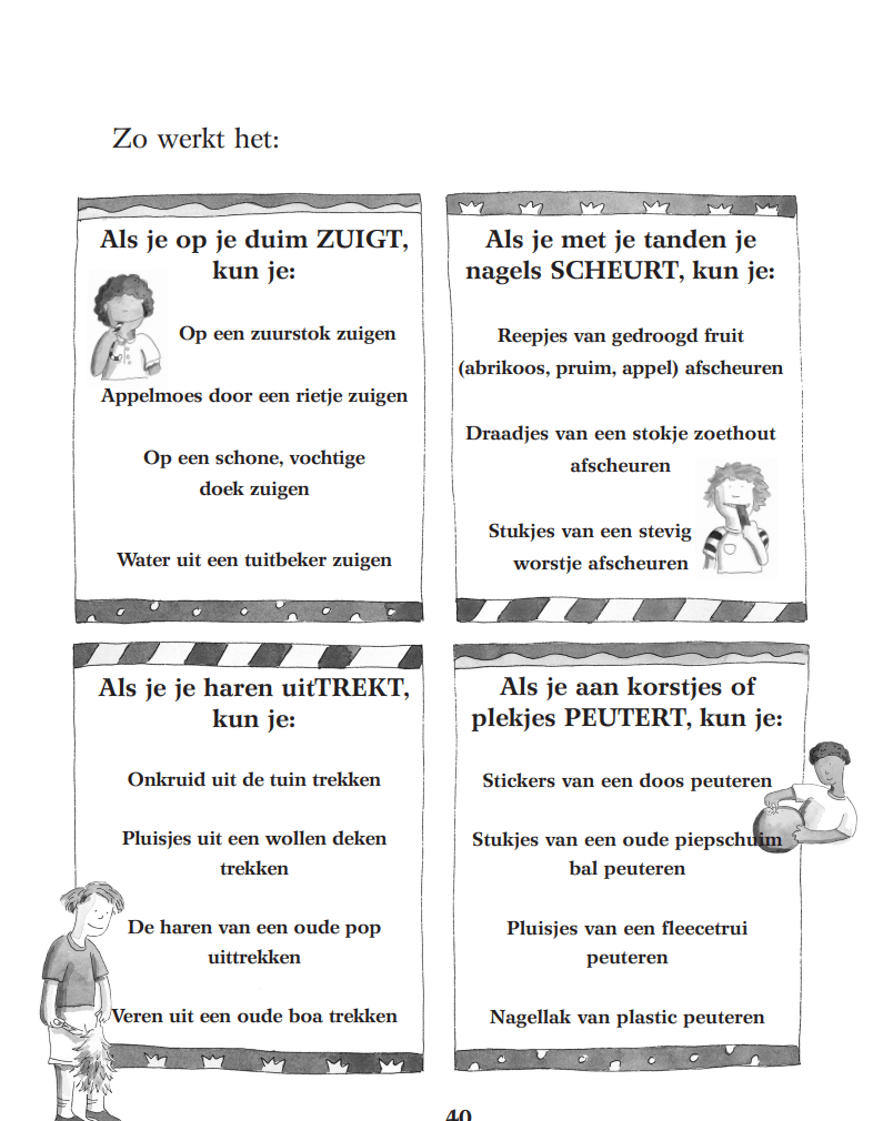 Wat kun je doen als je gewoontes wilt afleren geeft de sleutels om te ontsnappen aan een heleboel vervelende gewoontes. Met sprekende voorbeelden, levendige illustraties, en stap-voor-stap-instructies helpt het kinderen gewoontedoorbrekende strategieën aan te leren. Waarbij alles wordt aangepakt, van nagelbijten en duimen tot shirtkauwen, haardraaien, en nog veel meer. Dit help-oefenboek is hét hulpmiddel om kinderen te leren hoe ze los kunnen breken uit hun gewoontes.