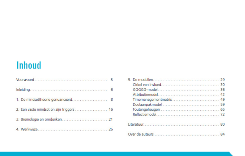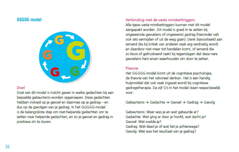 In deze Wijzer in Mindset vind je verdieping van de mindsettheorie: de nuances, de valkuilen, de valse groeimindset en de triggers van een vaste mindset. Met behulp van een verzameling bestaande en zelf ontwikkelde modellen (Cirkel van invloed, GGGGG-model, Attributiemodel, Timemanagementmatrix, Doelaanpakmodel, foutengeheugen, Reflectiemodel) kun je gedachten – en daarmee gedrag – positief sturen. Aan de hand van de theorie leer je vaste mindset-triggers bij je leerling of coachee te herkennen. De coachingskaarten helpen je vervolgens daarop in te spelen, zodat hij of zij de juiste mindset verder kan ontwikkelen.